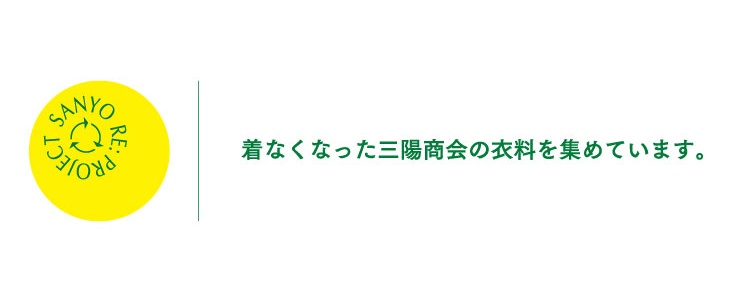 当社の3R活動の総称「SANYO RE: PROJECT」の一環として、当社製の衣料品・一部雑貨製品を対象店舗にて回収しています。回収品1点につき、全国の対象店舗と公式オンラインストアでお使いいただける「サンヨー・メンバーシップポイント」を500ポイント進呈しています。