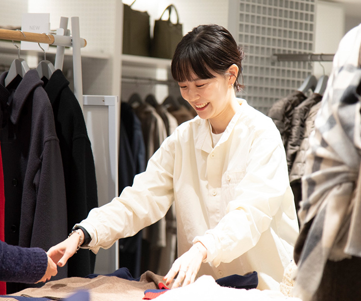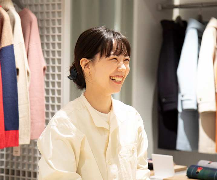 2021年に誕生した新ライン「マッキントッシュ フィロソフィー “グレーラベル”」の店舗の店長として、店舗の目標達成やブランド全体の成長を目指しています。本社の専門職と連携しながら店頭VMDを行ったり、予算・在庫・スケジュールを管理したり、販売の目線から商品づくりに携わるなど、業務は多岐にわたります。