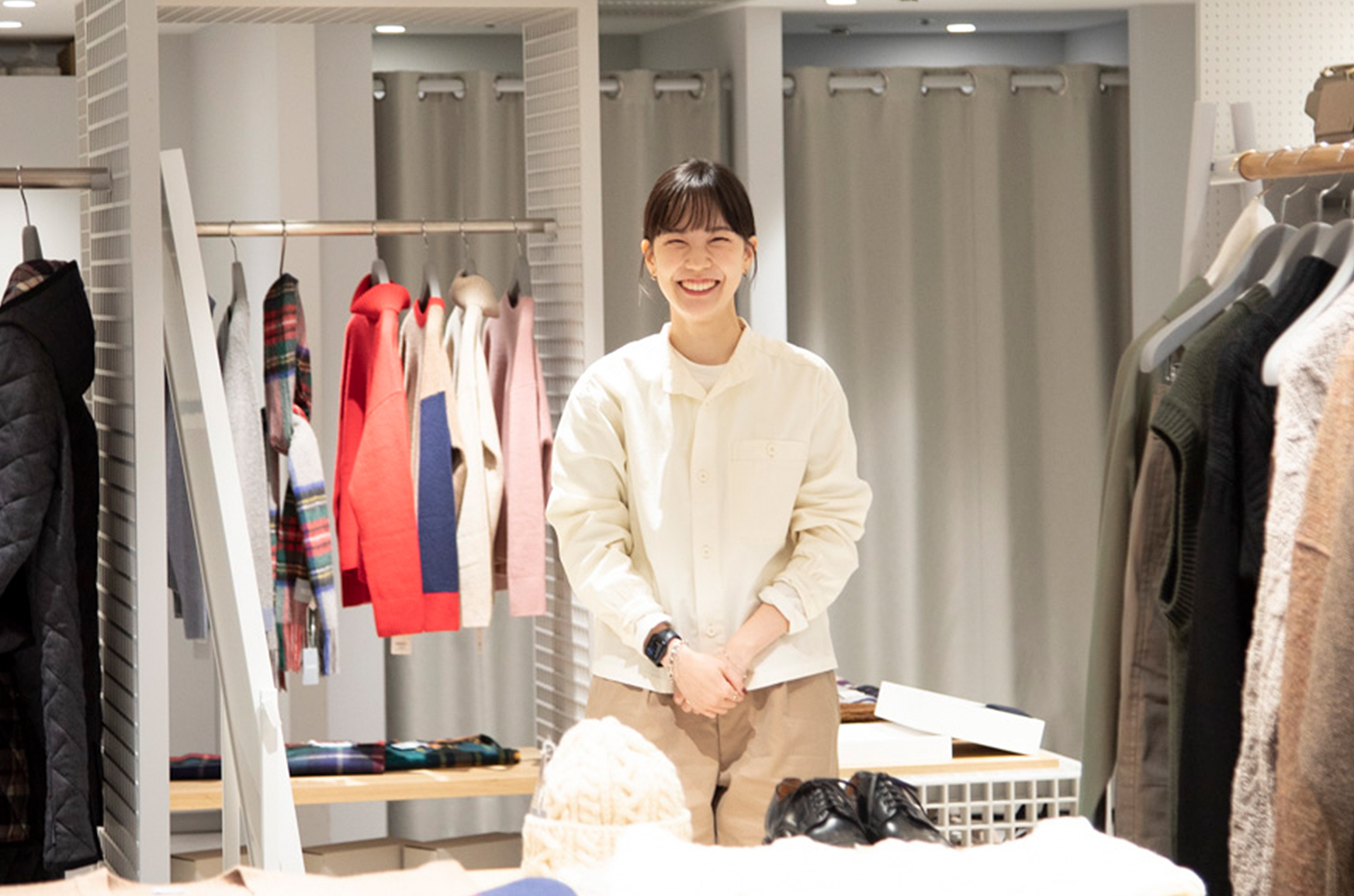 アパレル業界を志望し複数社を見ていく中、社員の年齢層が幅広く、十数年後まで働けるイメージができたこと、産休・育休を経て活躍している社員が多いことに魅力を感じた。最終的には、選考中に人事担当や面接官から感じた「人の温かさ」を決め手に入社を決めた。